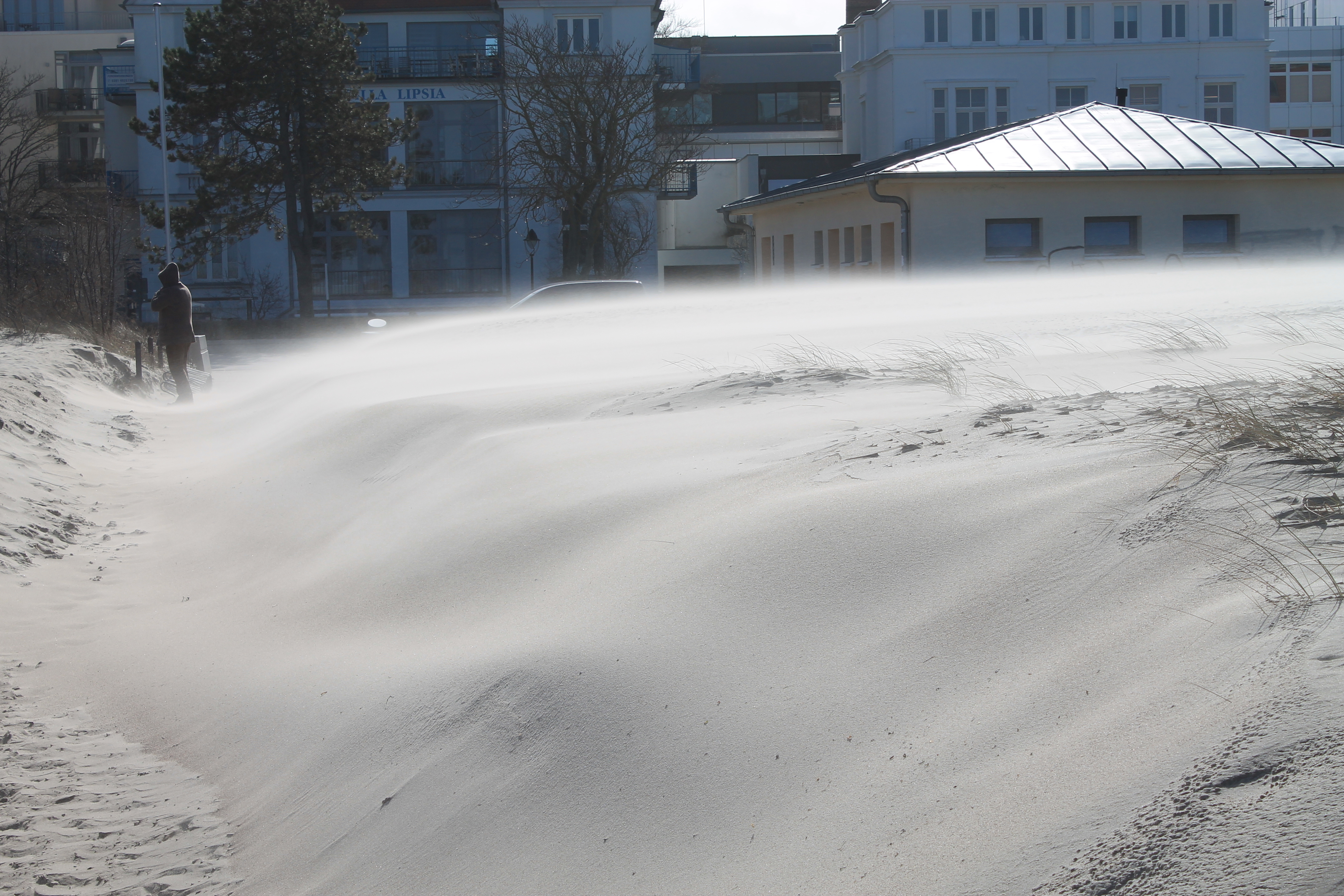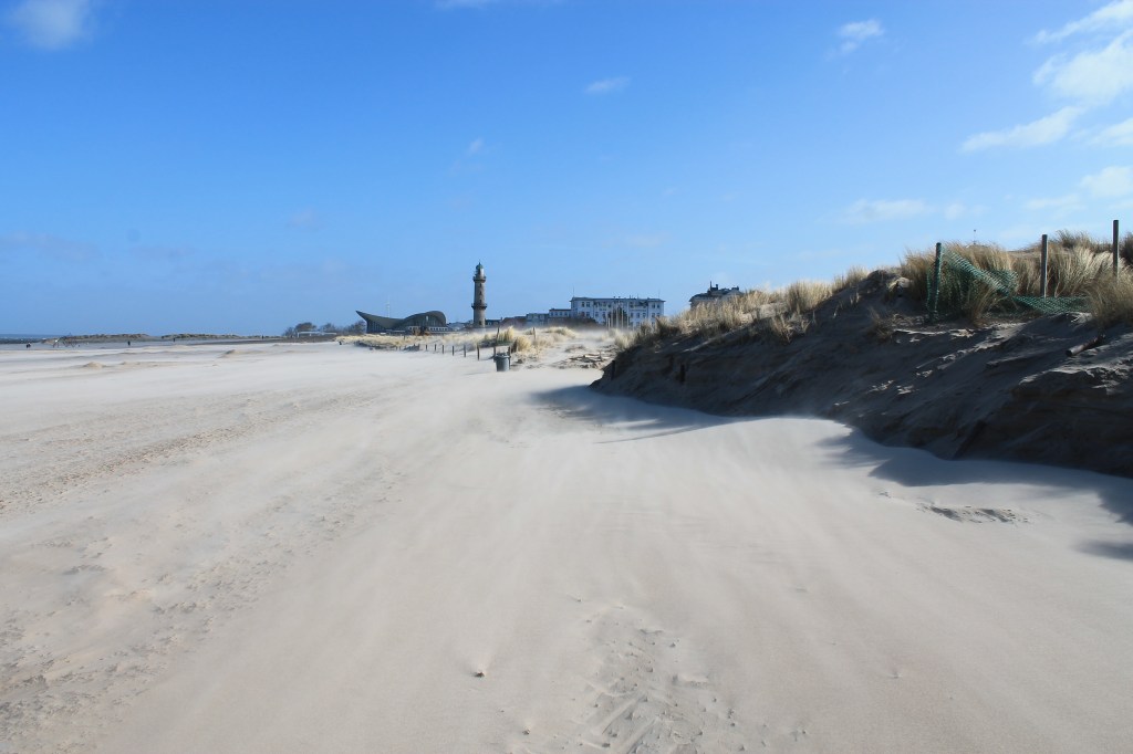 Ein weiteres Sturmtief beeinflusste Mecklenburg-Vorpommern und brachte verbreitet stürmische Böen, im Osten des Landes sowie generell an der Ostseeküste Sturmböen (Bft 9) bis hin zu schweren Sturmböen (Bft 10). Bei trockenem und sonnigem Wetter machte sich am Warnemünder Strand der feine Sand wieder auf den Weg nach Osten…