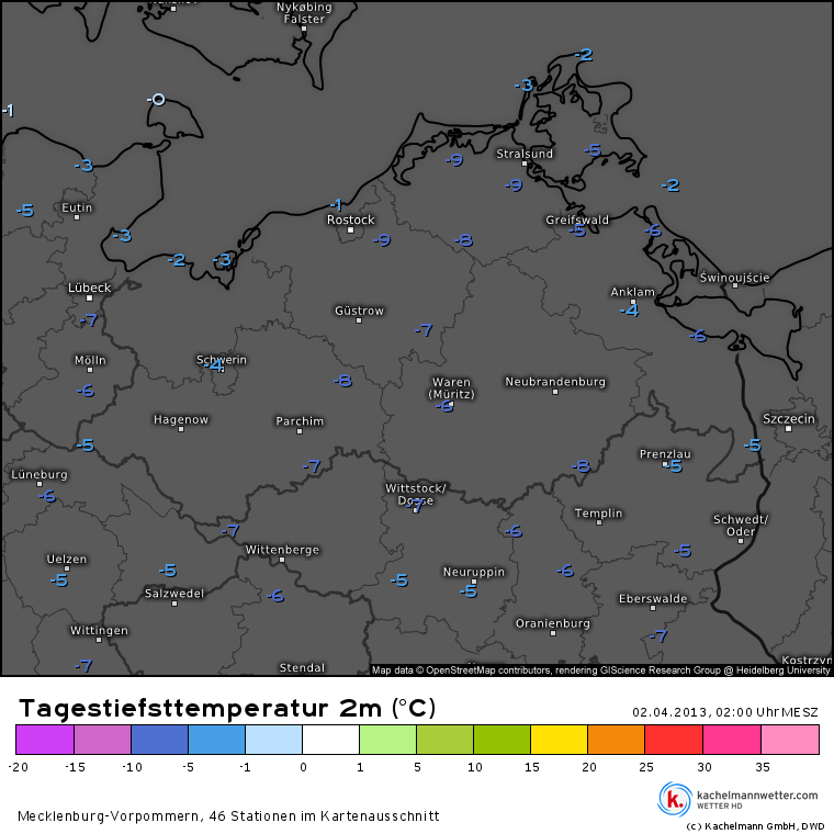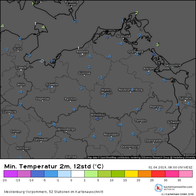 Heute vor 6 Jahren lagen die Temperaturen am Morgen des 01.04.2013 übrigens noch tiefer im Minus. Bis zu -9°C kalt war es damals im nördlichen Vorpommern: