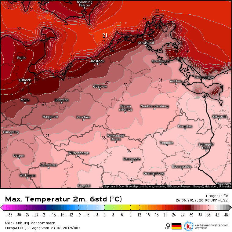 Am ehesten sind neue Stationsrekorde im Südosten Vorpommerns möglich, dort liegt der zu schlagende Maximalwert allerdings noch höher. Hier für Ueckermünde, wo der Juni-Landesrekord „zu Hause“ ist.