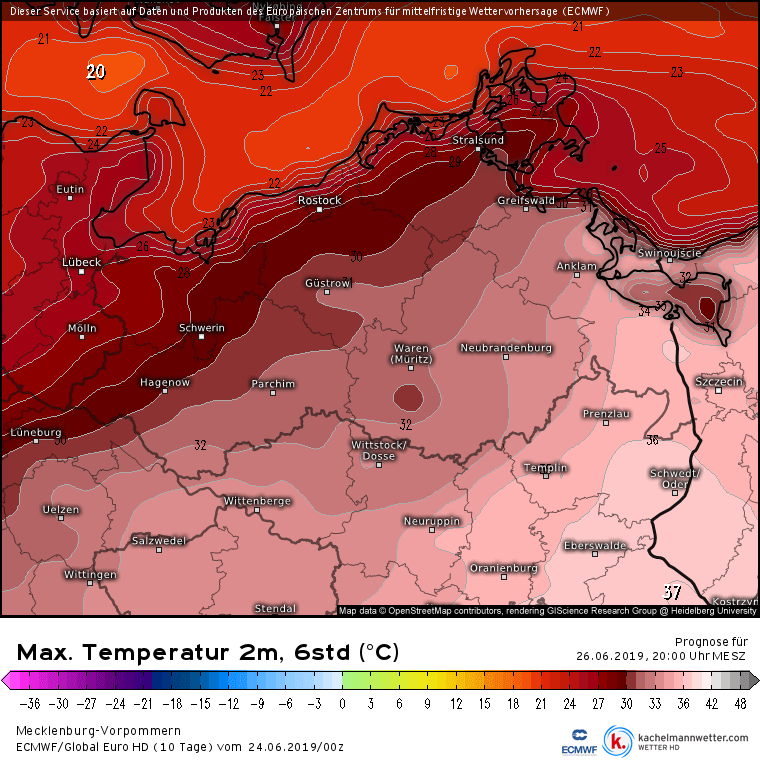 Aktuelle Tmax-Modellprognose für Mittwoch (26.06.)- SuperHD / ICON / ECMWF