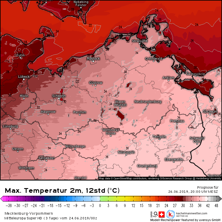 Ein spannender und interessanter Wettertag könnte dennoch der Mittwoch werden. Hier simulieren die Modelle momentan bis zu 36°C in der Südosthälfte von M-V. Der Juni–Temperaturrekord für Mecklenburg-Vorpommern liegt bei 36,1°C (Teterow, Ueckermünde / 20.,21.06.2000) und würde in „Gefahr“ geraten. Ob wirklich eine neue Höchstmarke aufgestellt wird, hängt von Details ab, welche 3 Tage im Voraus nicht zu klären sind. Bewölkung könnte die Einstrahlung dämpfen und eine schnell auf Nordwest drehende Bodenströmung die Hitze bereits nach Berlin/Brandenburg abdrängen. Gerade im Westen des Landes sind neue Monatsrekorde mittlerweile sehr unwahrscheinlich. Dennoch einmal ein Blick auf die Spitzenwerte der langjährigen Messreihen von Schwerin, Greifswald und Warnemünde.