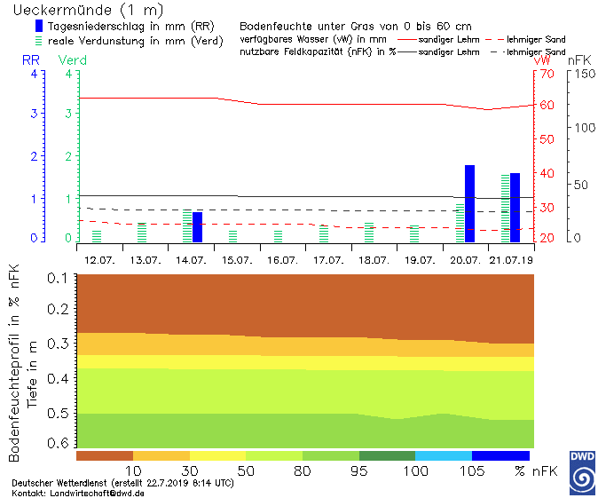 Abschließend ein Blick auf die Stationsgrafiken des DWD zur Bodenfeuchte in der Schicht von 0 bis 60 cm unter Gras (unteres Diagramm). Farblich dargestellt ist die nutzbare Feldkapazität in %. Vereinfacht ausgedrückt handelt es sich dabei um das pflanzennutzbare Wasser. Als Beispiel wurden Groß Lüsewitz südöstlich von Rostock und Ueckermünde ausgewählt.