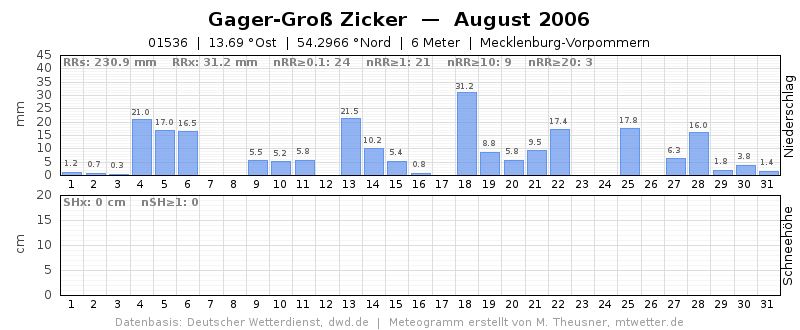 Das Monatsdiagramm der niederschlagsreichsten Station des 2006er August in MV. Gager-Groß Zicker, im Süden der HI Mönchgut auf Rügen gelegen, verzeichnete 230,9 l/m², verteilt auf 24 Niederschlagstage. In Putbus gab es sogar extreme 26 Tage mit messbarem Niederschlag. Demzufolge Unmut bei den Sommerurlaubern, welche jedoch im Vorgängermonat Juli bei Sonne und Hitze bereits auf ihre Kosten kamen.
