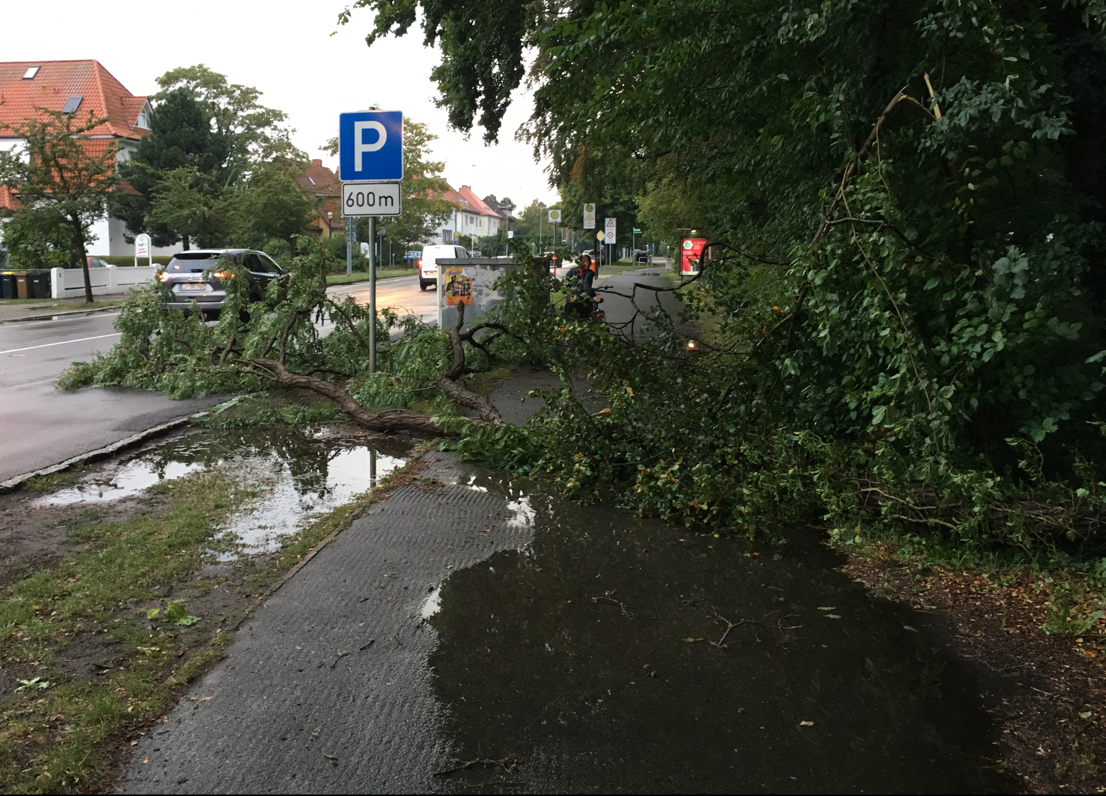 Nach Abzug dieses Komplexes über die Ostsee lockerte der Himmel im Raum Rostock wieder auf. Weiterhin war es schwülheiß mit Temperaturen um 32°C. Etwa 17 Uhr brodelte es erneut und direkt über der Südstadt ploppte eine sehr intensive, aber örtlich begrenzte Gewitterzelle auf. Diese produzierte mehrere starke Erdblitze, welche u.a. im Hansaviertel einschlugen. Unter Abschwächung zog dieses Gewitter nach Nordwesten ab.