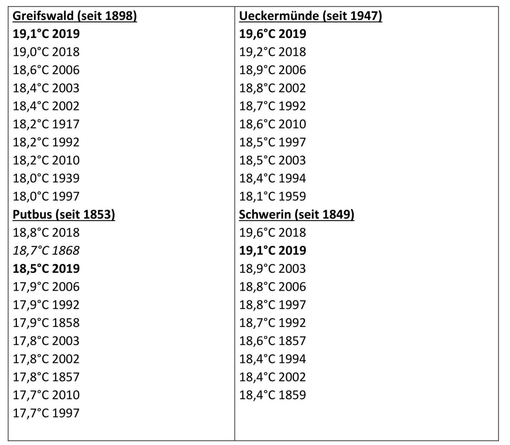 Zurück zum Sommer 2019: Es gibt regionale Unterschiede bei der Einordnung. Im Osten und Südosten Vorpommerns schloss der diesjährige Sommer sogar als wärmster seit mindestens 1834 ab. In den langjährigen Messreihen von Greifswald und Ueckermünde steht der 2019er Sommer nun an der Spitze und löst den Vorjahresvertreter direkt wieder ab. In den westlichen und nördlichen Landesteilen bleibt der Sommer 2018 ungeschlagen (siehe Hitliste von Schwerin).