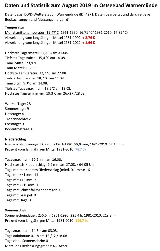Die Mitteltemperatur lag im August 2019 bei 19,47 °C, damit war der Monat rund 1,7 K wärmer als das Referenzmittel der Periode 1981-2010. Gegenüber dem WMO-Mittel der Jahre 1961-1990 betrug die Abweichung +2,8 K. Demnach erfolgt die Einordnung als sechstwärmster August in der Warnemünder Temperaturreihe seit 1901. Spitzenreiter ist der August 1997 (Mitteltemp. 21,6°C), gefolgt von 2002 (20,1°C), 2018 (20,1°C), 1975 (19,8°C) sowie 1995 (19,7°C).