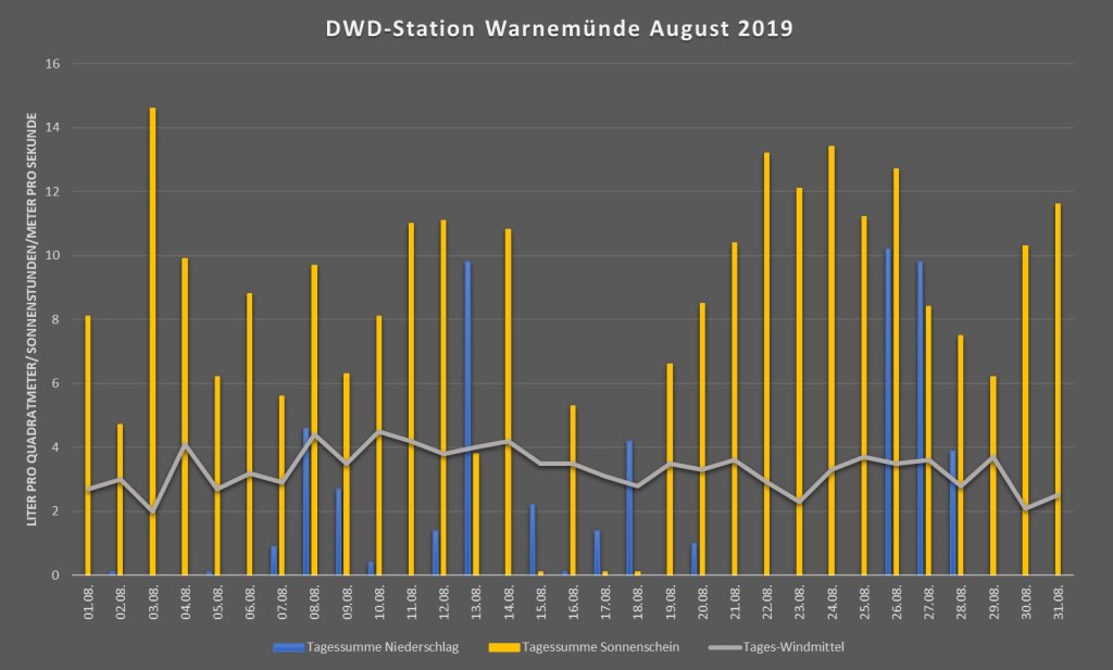 Niederschlag / Sonnenschein / Windmittel August 2019 – Warnemünde