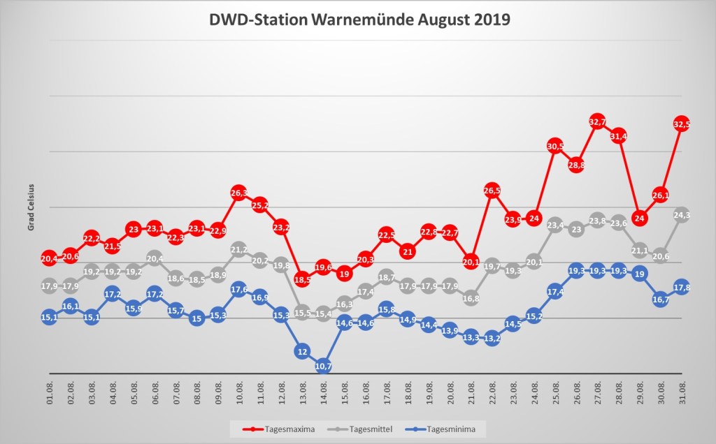 Temperaturverlauf August 2019 – Warnemünde