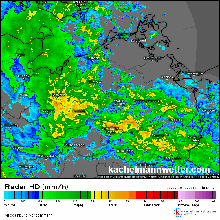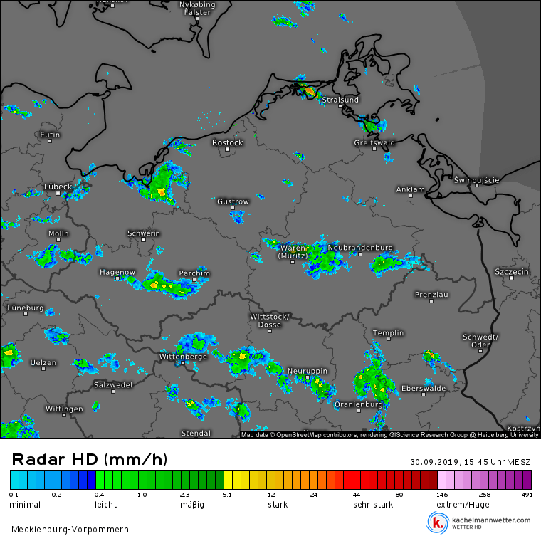Kräftige schauerartige Regenfälle im Bereich des Tiefkerns verlagerten sich zum Mittag von Mecklenburg nach Vorpommern. An der niederschlagsreichsten Station des Landes in Friedland summierten sich innerhalb von 12 Stunden 33 l/m².