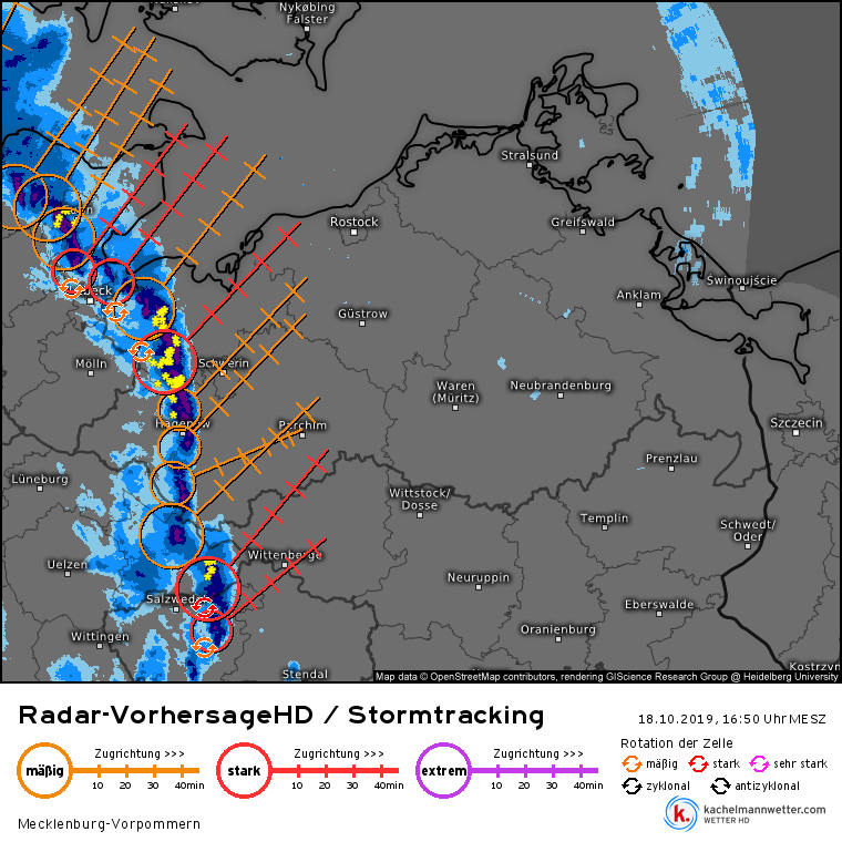 Gegen 16 Uhr näherte sich die Schauer- und Gewitterfront Westmecklenburg. Das Organisationsgrad konnte als sehr gut beschrieben werden, starke Echos und kleine Bogensegmente inklusive. Somit rückte der Wind als maßgeblicher Warnfaktor in den Vordergrund. Bereits in Niedersachsen und S-H meldeten Wetterstationen 9er bis 10er-Böen von 75 bis 100 km/h. Außerdem wies der Linie eine für Mitte Oktober beeindruckende Blitzaktivität auf. Zeitweise wurden zwischen Klützer Winkel und Landesgrenze zu Brandenburg 400 Blitze in nur 30 Minuten registriert.