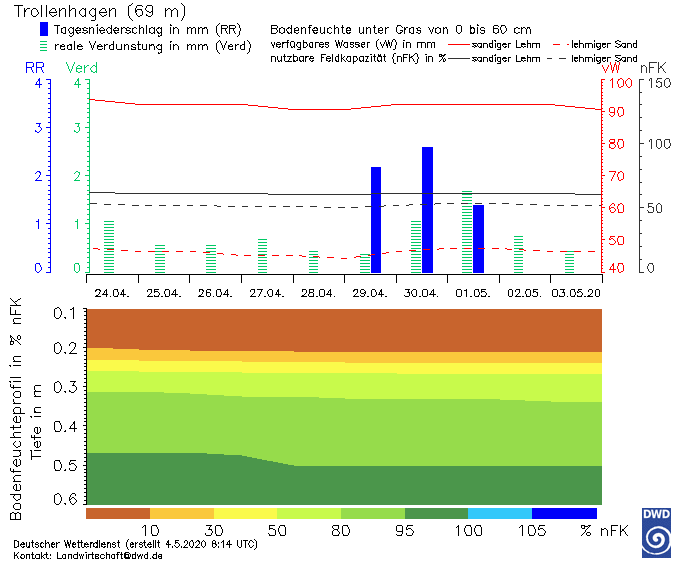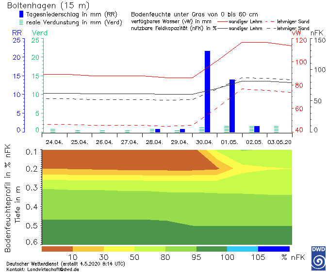 Die linke Grafik gehört zum Standort Boltenhagen in Nordwestmecklenburg, dort ist der ergiebige Regen aus der Nacht vom 30.04 zum 01.05. deutlich abzulesen. Die braunen Dürrefarben bis 0,2 m Bodentiefe sind verschwunden, die oberen Schichten wurden somit gut durchgewässert.