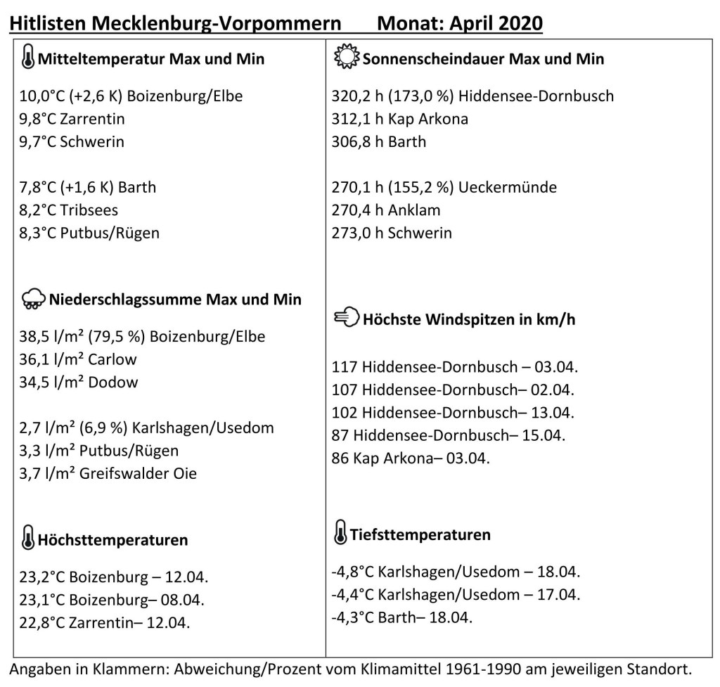 Der zweite Frühlingsmonat des Jahres 2020 weist im Gebietsmittel von Mecklenburg-Vorpommern eine Temperatur von rund 9,0°C auf, nur im Bundesland Schleswig-Holstein gab es niedrigere Durchschnittstemperatur. Dennoch lag die Abweichung zum Vergleichswert der „alten“ Klimaperiode 1961-1990 mit etwa 2,3 K deutlich im positiven Bereich. Als Besonderheit muss die hohe Anzahl von Frostnächten erwähnt werden, im 24-stündigen Tageszeitraum traten an der Station Tribsees 16-mal Minusgrade auf, am Erdboden sackte die Anzeige sogar 26-mal unter den Gefrierpunkt.