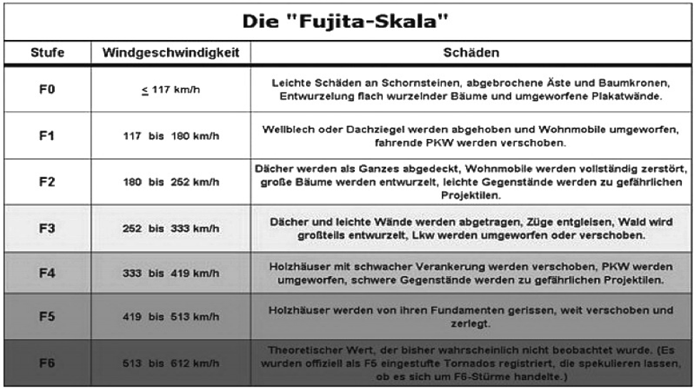 Abb. 4: Fujitaskala zur Einstufung und Schadensklassifikation von Tornados