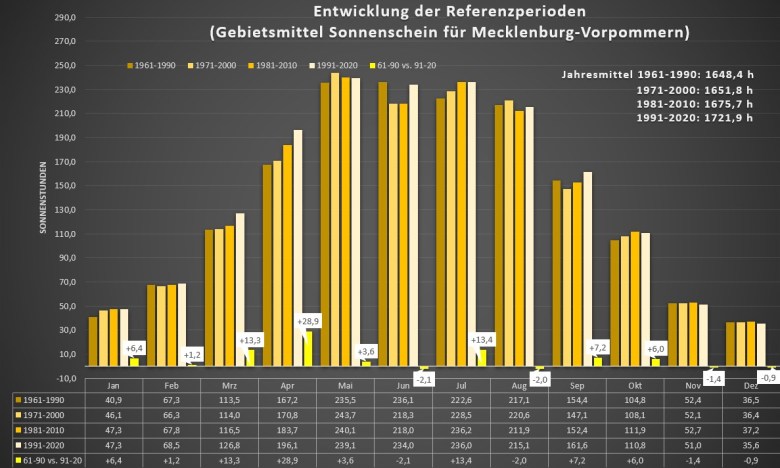 Auch die Sonne lässt sich seit den 1960er-Jahren häufiger blicken. Besonders die Frühlingsmonate können bezüglich der Sonnenscheindauer mit einem ansteigenden Trend aufwarten. Insgesamt zeigt sich die Zunahme an Sonnenstunden ebenfalls beim Jahresmittel, welches von 1961-1990 zu 1991-2020 in Mecklenburg-Vorpommern um 73,5 Stunden anstieg. Dagegen lässt sich im Juni, August, November und Dezember kein klares Bild erkennen und die Sonnenscheinsumme ist teils marginal gesunken.