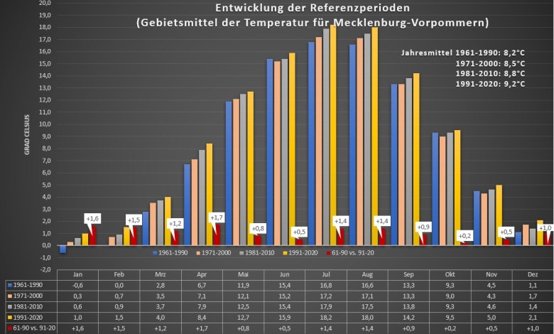 Mit der neuen Referenzperiode bzw. dem neuen 30jährigen Mittel von 1991 bis 2020 wird die Klimaerwärmung auch für das Bundesland Mecklenburg-Vorpommern sehr deutlich.