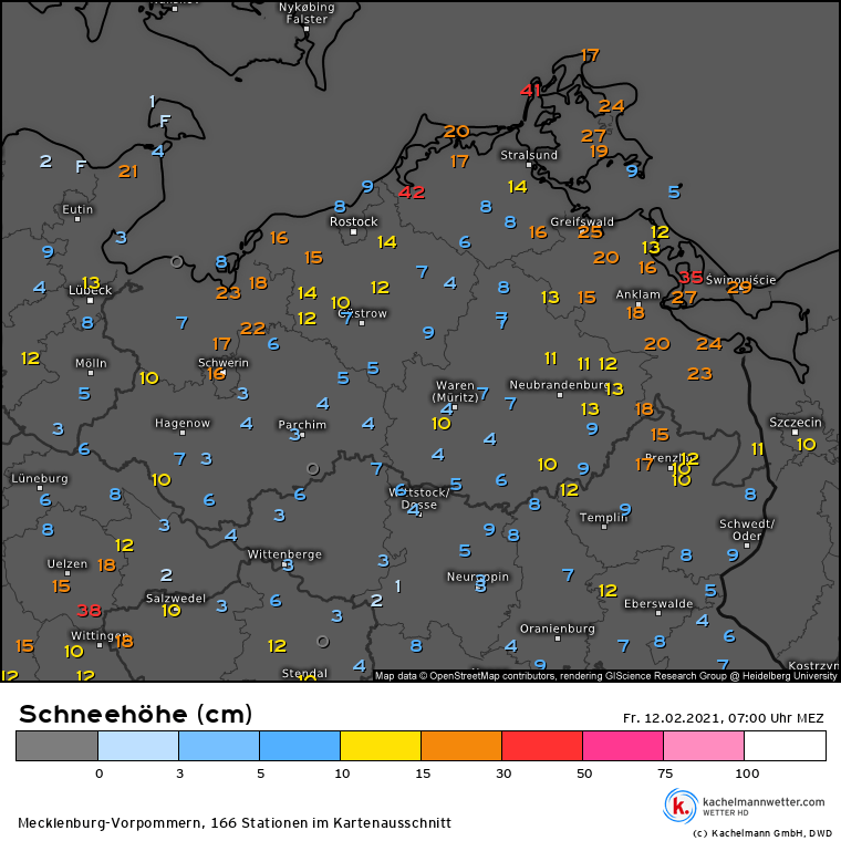 MV fast landesweit im Winterkleid, am wenigsten Schnee in Teilen von Südmecklenburg. Die „0“ in Boltenhagen ist auf die automatische Laserstrahlmessung zurückzuführen, böiger Nordostwind wehte den lockeren Schnee vom Messfeld weg.