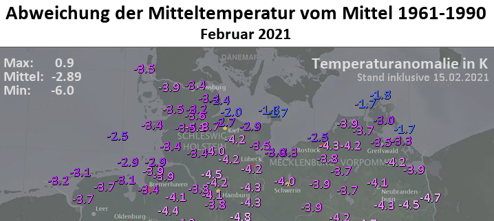Die Mitteltemperaturen für den Februar 2021 liegen mit Stand vom 15.02. bei minimal -5,2°C in Grambow-Schwennenz und max. -1,5°C auf Hiddensee und am Kap Arkona. Die folgende Karte zeigt die Abweichung vom Klimamittel der Periode 1961-1990 für den Gesamtmonat Februar am jeweiligen Standort. Wäre der Monat nun zu Ende, ließe sich ein Minus/ negative Abweichung von -2 bis -3 K entlang der Ostseeküste und sogar von knapp -5 K im äußersten Südosten vermelden. Dort wäre der Februar also rund 5°C zu kalt ausgefallen. Nun stehen allerdings noch die Hälfte aller Februartage bevor und die Zeichen stehen auf (fast schon frühlingshaft) mild, sodass sich die Durchschnittstemperatur noch dem Klimamittel annähern wird.