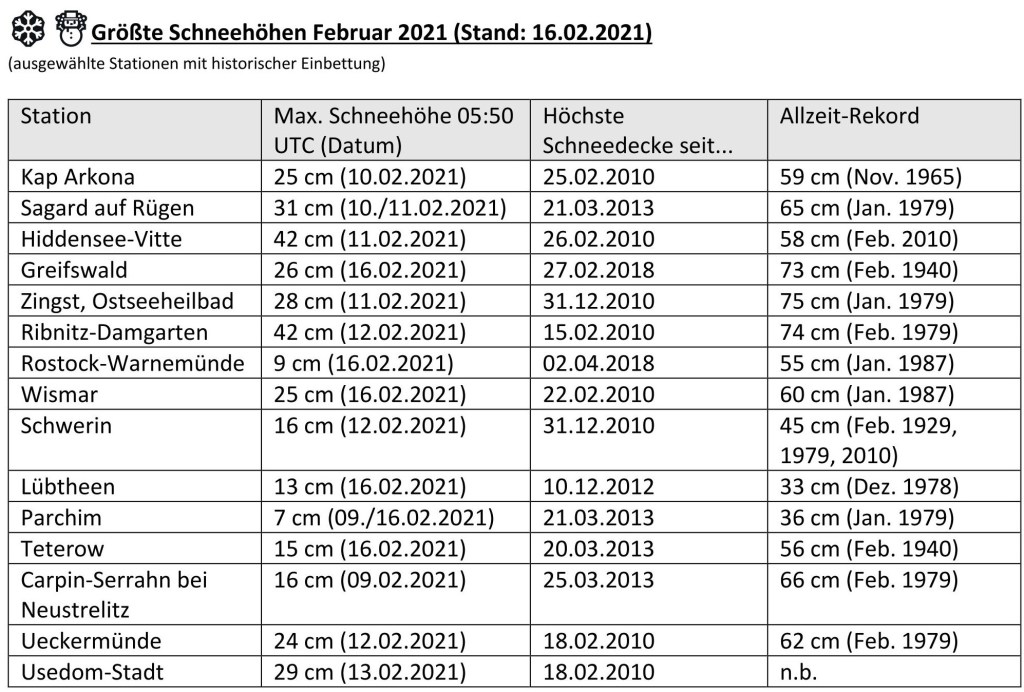 So wurden in den „Hotspots“ ab dem 10.Februar lokal Schneehöhen von 25 bis über 40 cm gemessen. Die Schwerpunkte lagen auf Rügen, Hiddensee sowie Usedom und am Greifswalder Bodden, sowie eng begrenzt von Ribnitz-Damgarten bis in den Rostocker Süden und eine weitere schmale Linie verlief vom westlichen LK Rostock über Wismar bis etwa nach Schwerin.