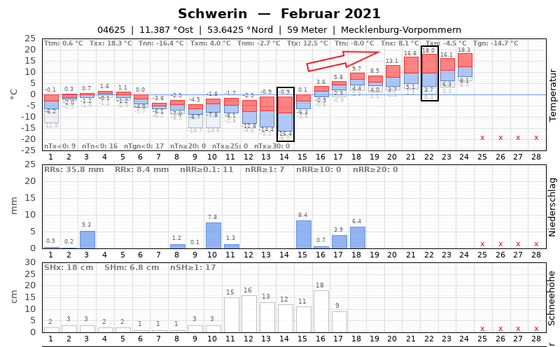 Abschließend sei noch die verrückte Wende vom Hochwinter in den inoffiziellen Frühling am Beispiel Schwerin visualisiert. Am Morgen des 14.02.2021 sank das Thermometer bis auf eisige -16,4°C ab, 8 Tage später werden 18°C gemessen und Eis und Schnee erscheinen plötzlich meilenweit entfernt. 34°C Differenz zwischen diesen Extremspitzen! , und nur etwas mehr als eine Woche dazwischen.