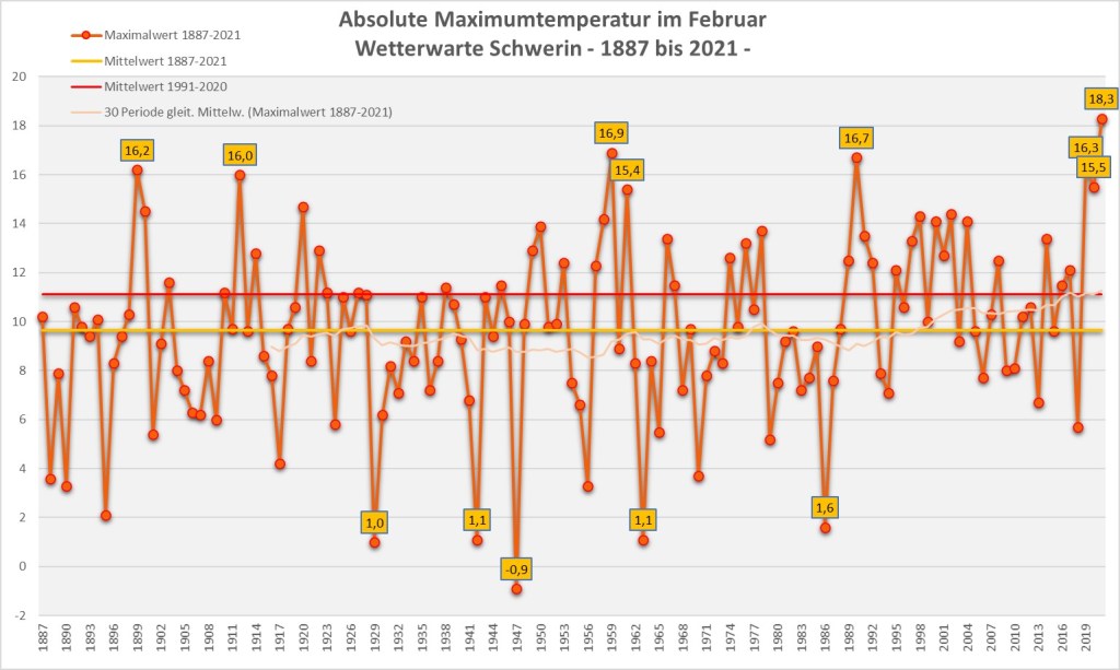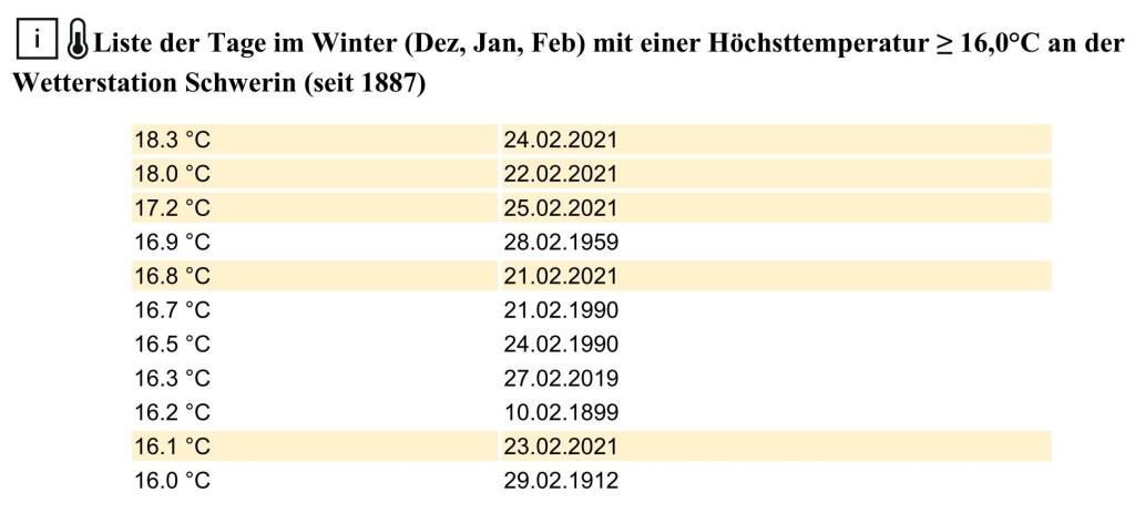 Darüber hinaus ein weiterer Fakt zum Staunen: Die Schweriner Höchsttemperatur am 24.02.2021 von 18,3°C entspricht in etwa der mittleren Höchsttemperatur eines Tages Mitte/Ende Mai in der zweitgrößten Stadt des Landes. Wahnsinn!