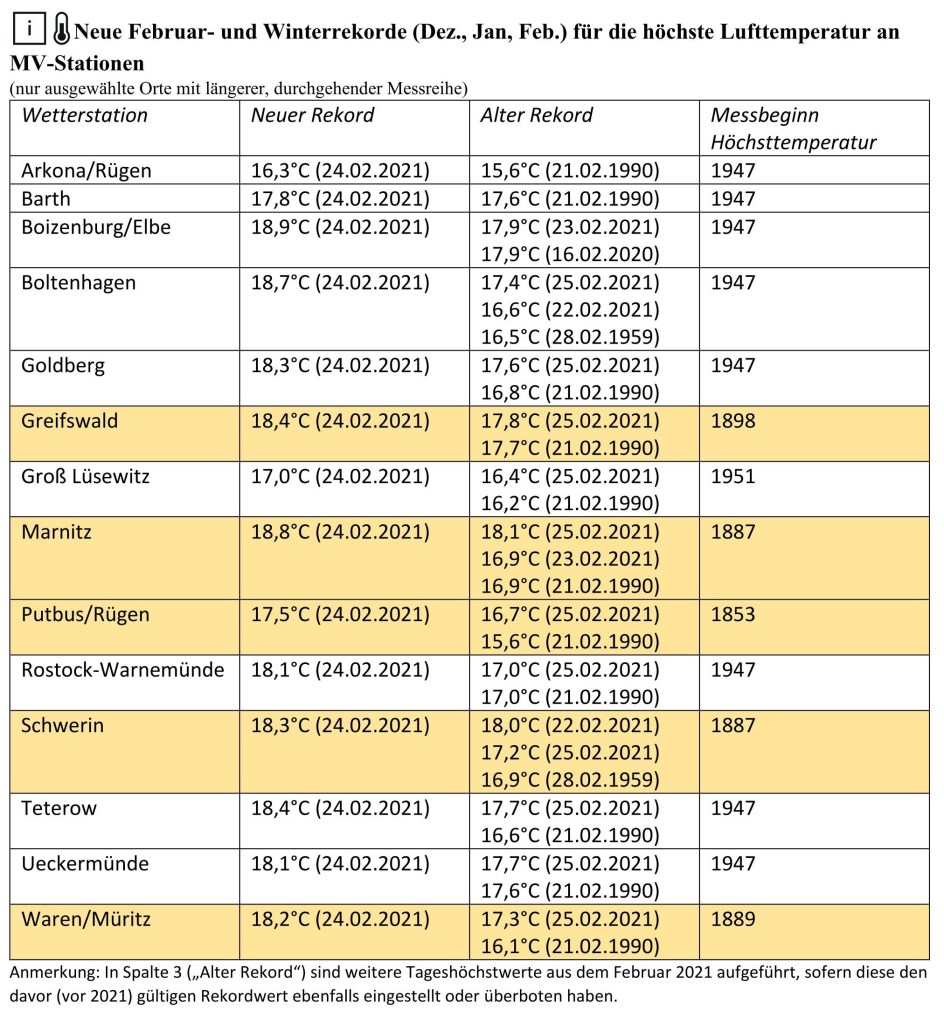 Hier nun die tabellarische Übersicht der neuen gültigen Februar-/Winter-Rekorde an ausgewählten Orten in Mecklenburg-Vorpommern: