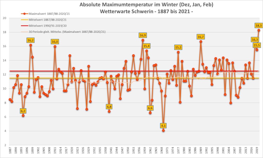 Es ist auch die Länge der Periode bzw. Aufeinanderfolge milder Tage, die es so bemerkenswert macht und in dieser Form noch nie vorgekommen ist. An einigen Stationen, zum Beispiel auch in der Landeshauptstadt Schwerin, gab es 5 Tage mit einer Höchsttemperatur von mindestens 16,0°C hintereinander. Landesweit betrachtet wurde vom 22. bis 25. Februar 2021 an 4 Tagen in Serie innerhalb von MV die 17°C-Marke überschritten. Das Klimadatenarchiv für das Bundesland weist aus, dass es seit Beginn regelmäßiger und zuverlässiger Temperaturmessungen (ab mindestens 1830) noch nie auch nur 2 Tage hintereinander Temperaturen von 17°C in den Wintermonaten gegeben hat.