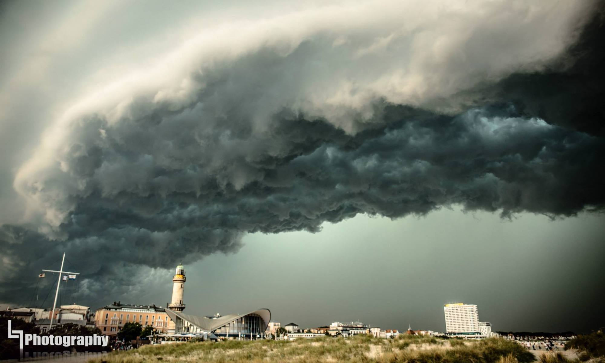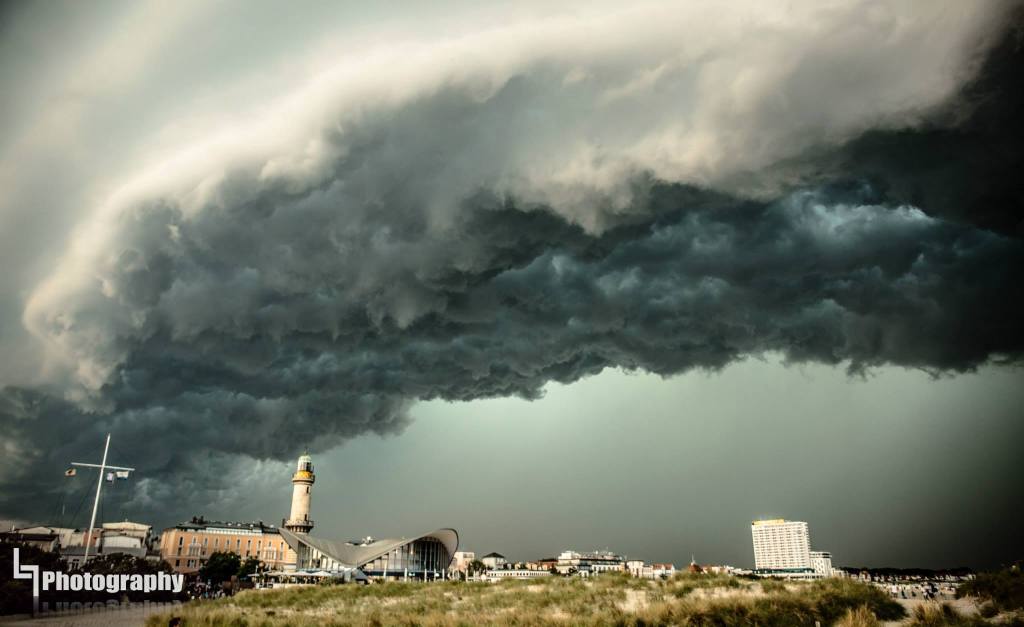 Als sich am Himmel bedrohliche Formationen entwickelten und der Wetterumschlug nahte, war der Strand in Warnemünde noch gut gefüllt. Fotos von Augenzeugen dokumentieren teils apokalyptische Szenen. Die Menschen flohen in Scharen und kurze Zeit später brachen gegen 18:45 Uhr Sturmböen und Starkregen über das Rostocker Ostseebad herein. Der Wind drehte mit Durchgang einer genialen Shelf Cloud (=> Erklärung siehe unten) abrupt von Südost auf West. Zudem war eine hohe Blitzaktivität zu beobachten, der Einschlag in ein Wohnhaus der Fritz-Reuter-Straße entfachte ein offenes Feuer und großen Sachschaden. In anderen Stadtteilen von Rostock traten Sturmschäden auf.