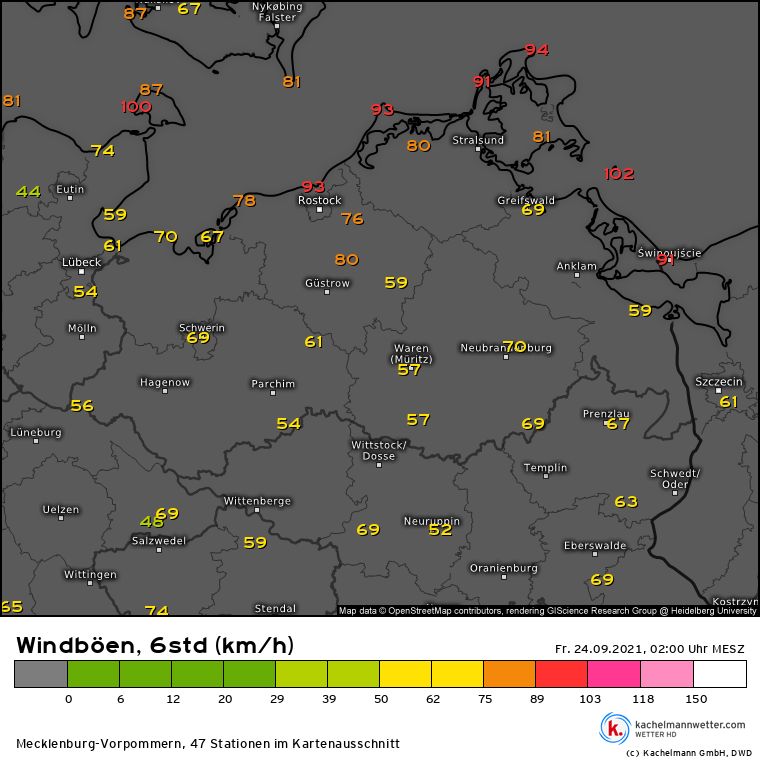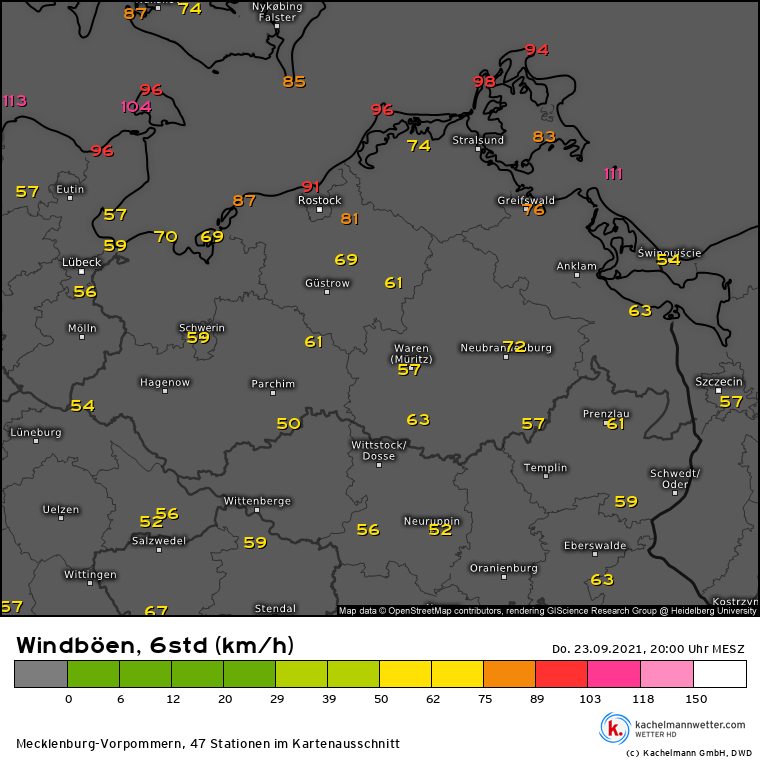 Spitzenböen Sturm TIM / 23.09.2021 in M-V (DWD-/DTN- und Kachelmannwetter-Stationen)