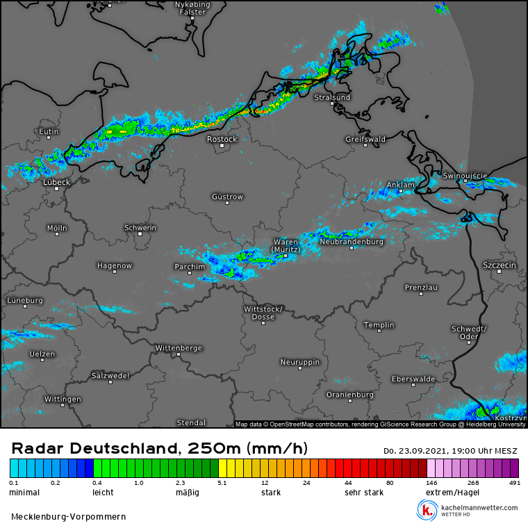 An dieser Schauerlinie (hier: grade auf die Nordküste treffend) traten die heftigsten Böen auf. Sie bewegte sich von Nord nach Süd von der Ostsee landeinwärts. Dahinter lockerte der Himmel auf und es blieb postfrontal trocken mit jedoch noch anhaltend starkem Mittelwind BFT 8 über der See.