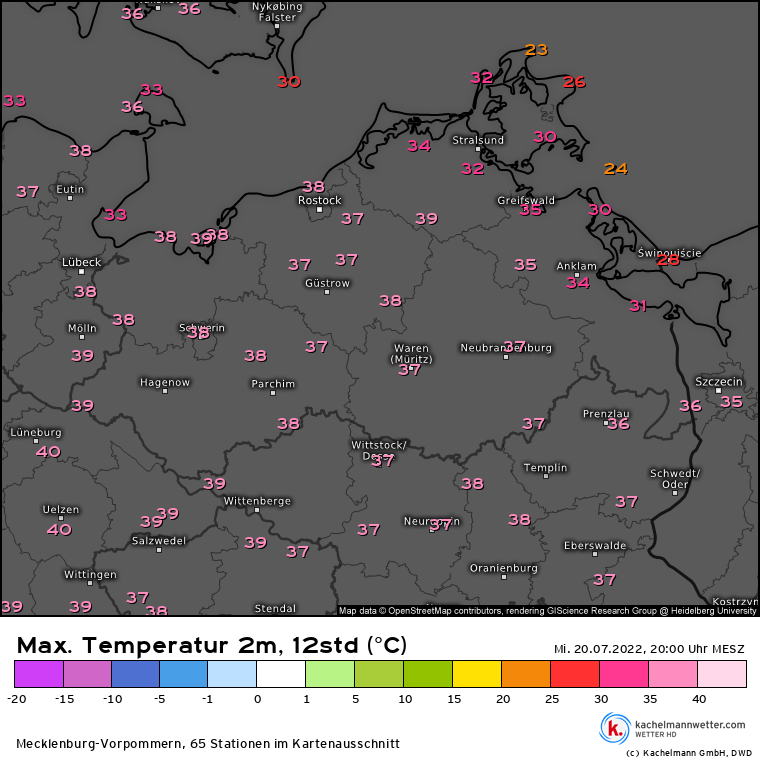Höchsttemperaturen 20. Juli 2022 in M-V (Messstationen von DWD und Kachelmannwetter)