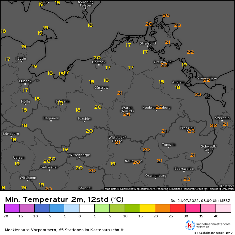 Dort wo der Wind bis zum Morgen nicht drehte, gab es teils eine Tropennacht (Tmin >=20,0°C). Alle auf der folgenden Karte in orange eingefärbten Werte signalisieren eine solche. Hervorzuheben ist insbesondere das Minimum aus Waren an der Müritz von 24,2°C! In der Klimadatenbank für Mecklenburg-Vorpommern liegt nur ein höheres Nacht-Minimum einer Station vor. In Neubrandenburg sank die Temperatur in der Nacht vom 09. zum 10. August 1992 nicht unter 24,7°C.