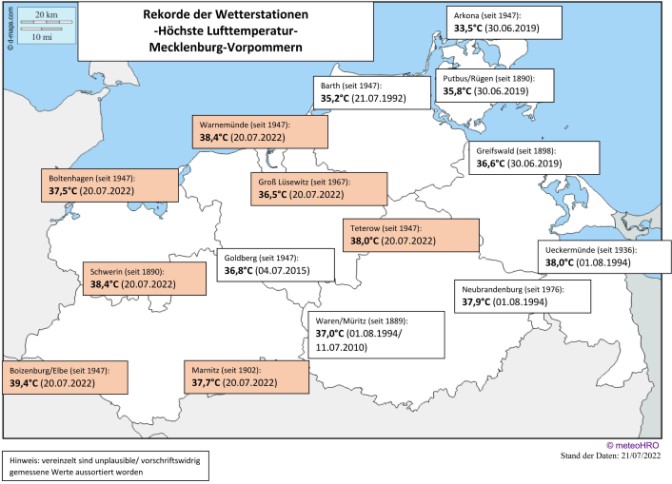 Liste der Tageshöchsttemperaturen vom 20. Juli 2022 aus M-V (Messnetze: DWD, DTN, KMW / möglicherweise fehlerwerte u. unplausible Werte in kursiv)