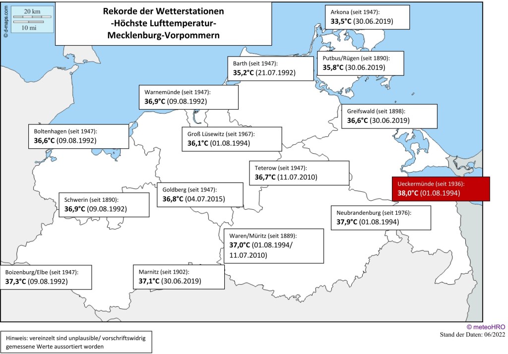 Im nördlichen und östlichen Vorpommern sind aufgrund des Seewindeinflusses und der geringfügig niedrigeren Höhenwärme (siehe Erläuterung 850hPa-Temperatur weiter oben) keine Rekorde der Höchsttemperatur gefallen. In Mecklenburg sind vielerorts die bisherigen Hitzerekorde vom 09. August 1992 abgelöst worden. Dies war zum Beispiel in Boizenburg, Schwerin, Boltenhagen und Warnemünde der Fall. Damals vor 30 Jahren war die räumliche Verteilung der Hitze und neuen Rekorde ähnlich wie diesmal am 20. Juli 2022, doch die Temperaturspitzen überragten das Vorgängerereignis.