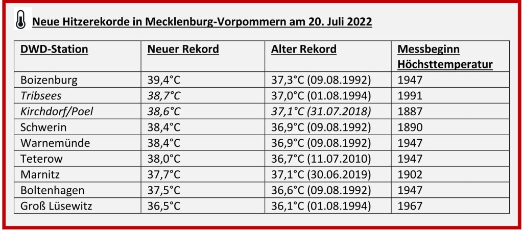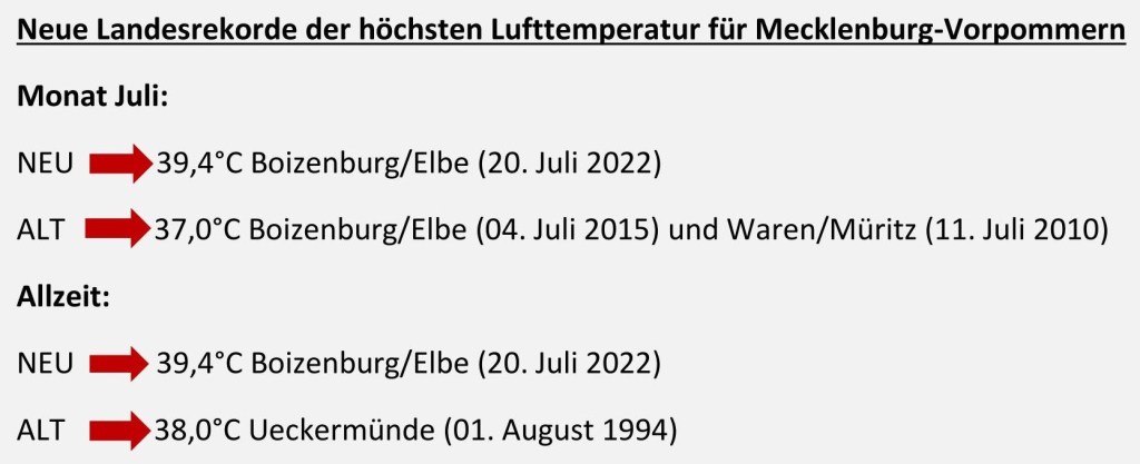 Blicken wir nun noch konkret auf die neu aufgestellten Rekorde für die höchste Lufttemperatur. Zunächst die Übersicht der Landeshöchstmarken. Der alte Julirekord, aufgestellt in 2010 und 2015, ist um gleich 2,4 K überboten worden! Der Allzeit-Hitzerekord stammte aus August 1994 und ist nun nach 28 Jahren um 1,4 K nach oben geschraubt worden und von Vorpommern (Ueckermünde) nach Mecklenburg (Boizenburg) gewandert. Es bleibt abzuwarten, wie viele Jahre es nun dauert, bis wir zum ersten Mal die 40 Grad hier im nordöstlichsten Bundesland sehen werden.