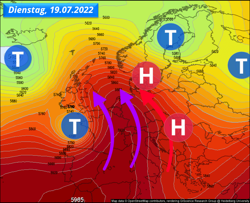 Bevor eine ausführliche Übersicht der Rekorde folgt, soll kurz die zugrunde liegende Wetterlage skizziert werden: Etwa ab Sonntag (17.07.) nahm die Entwicklung seinen Lauf. Zum einen ist Hoch „JÜRGEN“ zu nennen, welches zunächst noch westlich von uns lag. Durch diese Position des Hochs (Winde im Uhrzeigersinn) hatten wir es zunächst mit nur mäßig warmen Winden aus NW und Meeresluft von der Nordsee her zu tun. Zu Beginn der Woche wanderte „JÜRGEN“ über Deutschland hinweg südostwärts und die Strömung drehte auf Süd und subtropische Heißluft, welche schon länger über Spanien und Portugal vorherrschte, machte sich über Frankreich auf den Weg nach Norden und erreichte am Dienstag grob gesagt die Westhälfte des Bundesgebietes und am Mittwoch dann den Norden und Osten. Als wichtiger Antreiber fungierte außerdem ein kleines Höhentief, welches vor der Küste der Iberischen Halbinsel ungewöhnlich weit südlich ankerte und den Hitzevorstoß gen Norden verstärkte. Das Tief bewegte sich zum Dienstag weiter Richtung französische Atlantikküste und Ärmelkanal und trieb die Hitze auf der Vorderseite mit sich.
