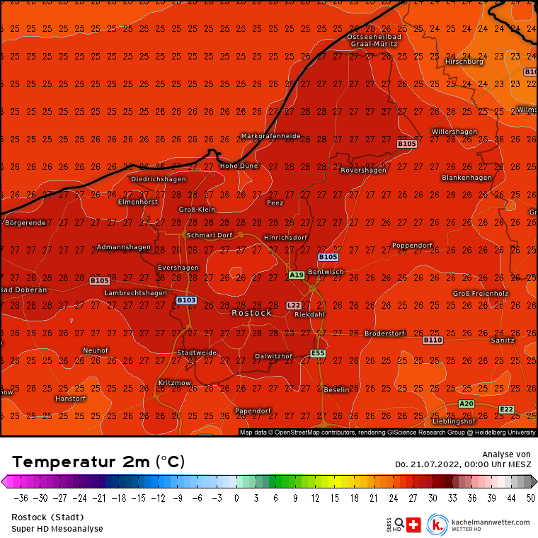 Der Bodenwind wehte großräumig aus Süd bis Südost, sodass die Hitze auch am mecklenburgischen Ostsee-Strand durchgreifen konnte. An den Ostküsten von Vorpommern kühlte dagegen Seewind (teils nur 22°C am Kap Arkona, während Warnemünde und Poel 38°C maßen!) und griff ein Stück weit ins Landesinnere aus. Erst ab etwa 19 Uhr sackten die Temperaturen in West-Mecklenburg mit Durchzug einer Konvergenzzone inklusive Windsprung von Süd auf West/Nordwest ab. Es kam im Zuge dessen jedoch nicht zu Regenfällen oder Gewittern, die Sonne schien weiterhin (wer dazu mehr lesen möchte => https://www.dwd.de/DE/wetter/thema_des_tages/2022/7/22.html). Dieser Windsprung arbeitete sich ostwärts vor, verlor aber an Dynamik und erreichte eine Linie Rostock-Parchim erst gegen 02 Uhr. Um Mitternacht lagen die Temperaturen in der Hansestadt noch bei mollig warmen 27-28°C!