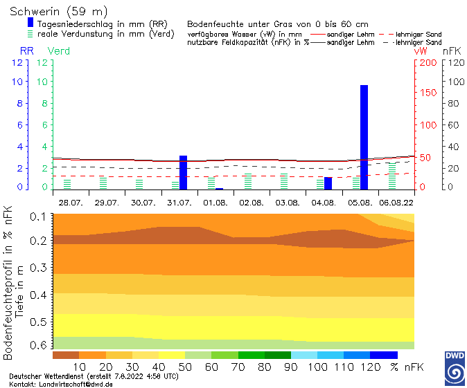 Dazu ein Blick auf die Stationsgrafiken des DWD zur Bodenfeuchte in der Schicht von 0 bis 60 cm unter Gras. Farblich dargestellt ist die nutzbare Feldkapazität in %. Vereinfacht ausgedrückt handelt es sich dabei um das pflanzennutzbare Wasser. Als Beispiel sei hier die Situation in Schwerin dargestellt. Im Bereich der Bodentiefe von 10 bis 30 cm ist teils nur 10-20 % der nutzbaren Feldkapazität (nFK) vorhanden und somit das Pflanzenwachstum stark bedroht. Die braunen Farben signalisieren dies. Außerdem zeigt die Grafik den doch sehr begrenzten Nutzen unergiebiger Regenfälle. Am 05.08. fielen rund 9 l/m² in Schwerin (siehe blauer Balken, obere Grafik). Die entsprechenden Auswirkungen auf das Bodenfeuchteprofil zeigt dann die untere Grafik. In den obersten Bodenschichten, bis etwa 20 cm, verdeutlichen die ins gelbe gehenden Farbtöne eine leichte Entspannung der Trockenheit, doch tiefer ist das Regenwasser nicht vorgedrungen. Mit Sonnenschein, Wind und geringer Luftfeuchte wird dieser Effekt in den nächsten Tagen rasch verschwinden und auch der Oberboden trocknet wieder ab. Nicht nur die reine Niederschlagsmenge ist entscheidend, sondern v.a. auch die Verdunstungsrate.