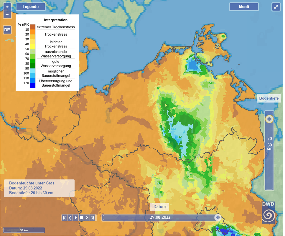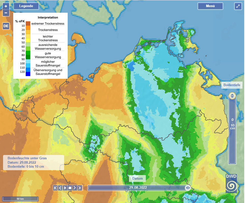 Man beachte die Legende in den Karten der Bodenfeuchte unter Gras. Je brauner die Färbung, desto höher der Trockenstress der Vegetation. Bei grünen bis blauen Farben spielt Dürre in den entsprechenden Bodentiefen keine Rolle. Die Trockenheit im Boden ist vor allem im Norden und Westen von Mecklenburg weiter deutlich ausgeprägt.