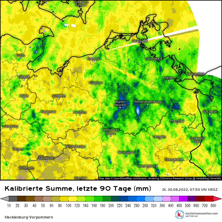 Während im Bereich der Seenplatte lokal eng begrenzt bis zu 300 l/m² zusammenkamen (Peak zwischen Waren und Neubrandenburg), erreichten manche Orte im nordwestlichen Mecklenburg nur 60-65 l/m²! Auch rund um Schwerin, im südlichen LK Ludwigslust-Parchim an der Grenze zu Brandenburg und im Bereich Nationalpark Jasmund auf Rügen war das Niederschlagsdefizit besonders stark ausgeprägt (teils < 80 l/m²). Vorrangig dort, wo die Karte gelblich bis braun eingefärbt ist, verlief der Sommer deutlich zu trocken.