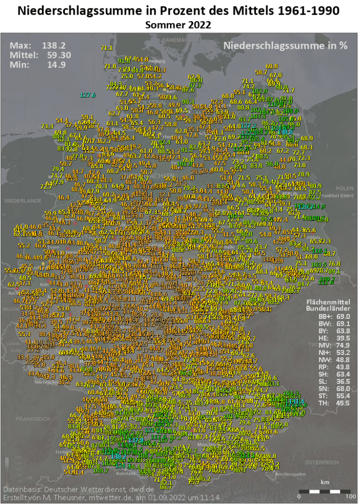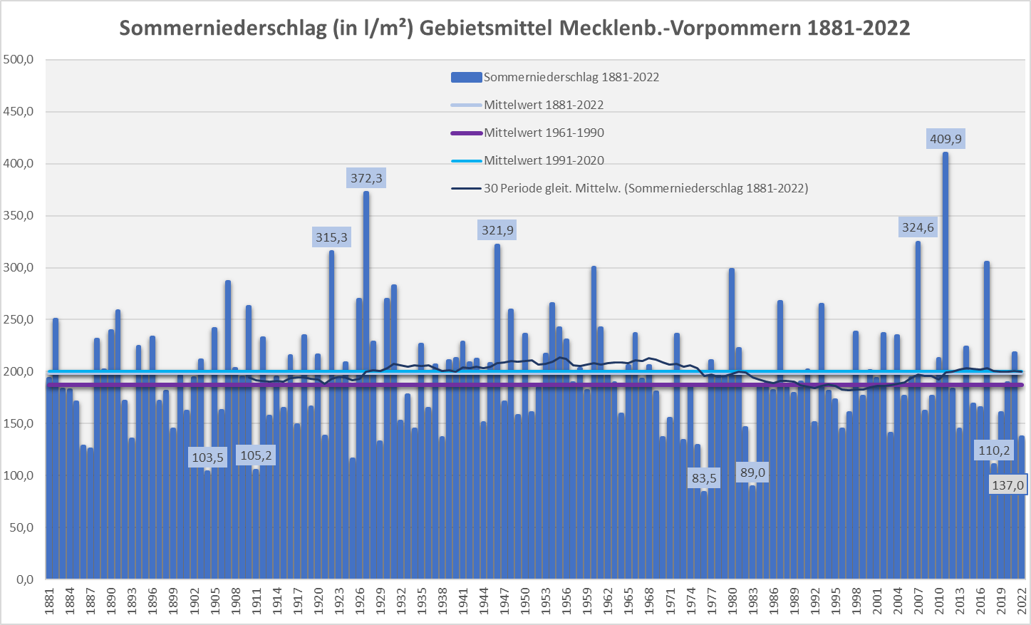 Erstmal zum Gebietsmittel: 137,0 l/m² errechneten sich für Mecklenburg-Vorpommern auf die Fläche betrachtet vom 01. Juni bis 31. August. Damit wurden 73,3 % vom Klimamittel der Periode 1961-1990 erreicht und 68,5 % verglichen mit dem neueren Referenzzeitraum 1991-2020. Nach der ersten vorläufigen Analyse belegt 2022 damit Platz 15 der trockensten Sommer seit 1881. Seit 1983 war lediglich 2018 (110,2 l/m²) noch trockener als 2022. Immer zu beachten gilt: Diese Einordnungen sind bezogen auf das Flächenmittel für ganz M-V. Pickt man sich bestimmte Orte und Städte heraus, variiert die Einstufung natürlich.