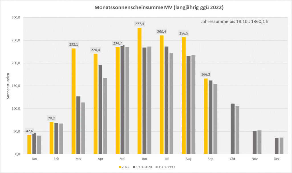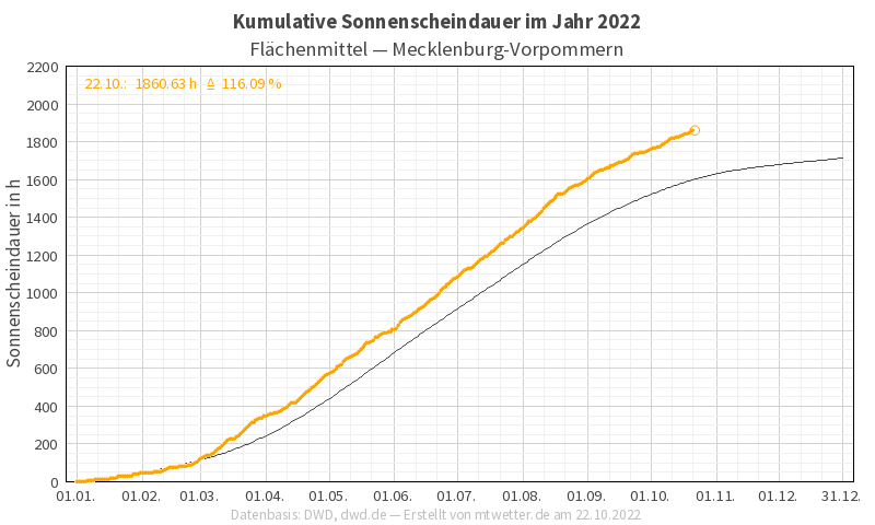 Die Jahressumme seit 01.01. beträgt mit aktuellem Stand vom 22. Oktober bereits 1865,8 h im Flächenmittel von MV. Wäre das Jahr bereits zu Ende, würde dies schon Platz 10 in der Hitliste der sonnigsten Jahre seit 1951 bedeuten. Doch einige Oktobertage und zwei weitere Monate folgen ja noch.