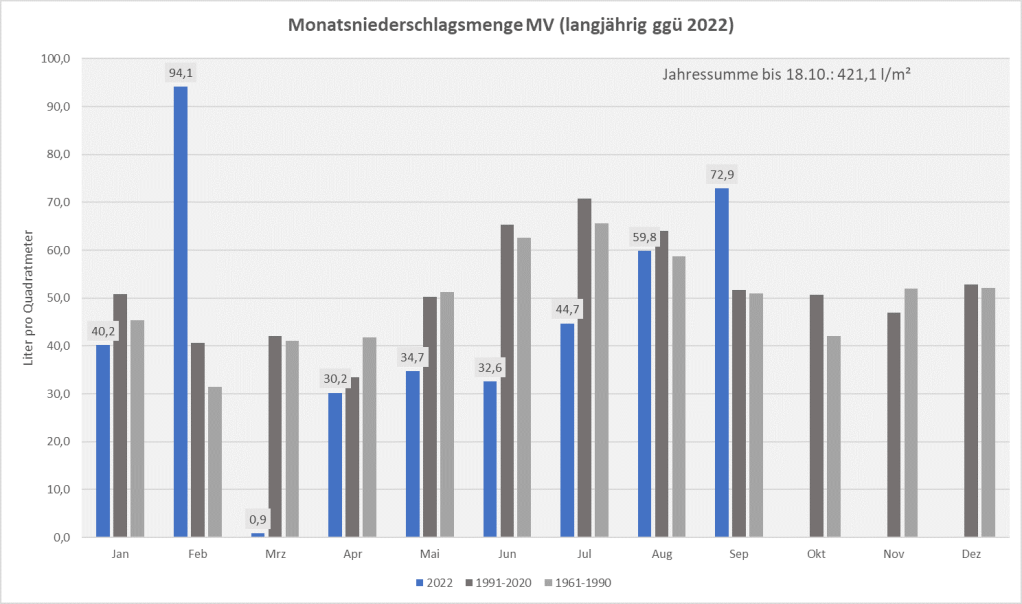 Die nächste Abbildung zeigt den Niederschlag der Monate bisher in 2022 (blau), verglichen mit den langjährigen Mittelwerten (grau) – bezogen auf das Flächenmittel von MV.