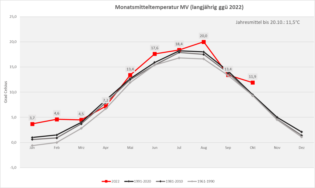 Wie schneidet 2022 in den bereits vergangenen 9 Monaten des Jahres hinsichtlich der drei Kernparameter Temperatur, Niederschlag und Sonnenschein ab? Dazu eine kurze Auswertung mit aktuellem Stand zu Beginn der dritten Oktober-Dekade. Alle Auswertungen beziehen sich auf das Flächenmittel des Bundeslandes Mecklenburg-Vorpommern.