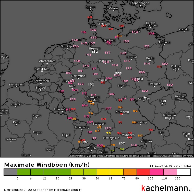 Die stärksten Windböen erreichten am 13. November 1972 auch im Binnenland verbreitet Orkanstärke. Spitzenreiter war damals der Brocken mit einer Spitzenböe von 245 km/h. Dabei lag der Harz noch knapp südlich des Hauptsturmfelds. In tiefen Lagen traten verbreitet 12er-Böen auf, die gebietsweise 150 km/h überstiegen. In Celle-Wietzenbruch lief das Gerät zweimal bis zum Anschlag bei 167 km/h und verharrte dort jeweils für 3 bis 4 Sekunden. Für höhere Windgeschwindigkeiten war die Messtechnik nicht ausgelegt.