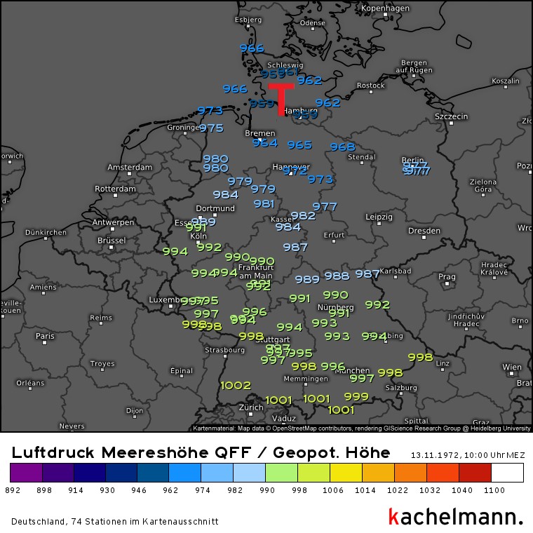 Die Karte mit den Luftdruckwerten am Vormittag des 13. November 1972 zeigt das Tief QUIMBURGA über Norddeutschland. Mehrere Stationen meldeten zu dieser Zeit einen Luftdruck von 959 Hektopascal. Zwischen dem Orkantief und hohem Luftdruck über Südwesteuropa herrschten extreme Luftdruckgegensätze. Zwischen Hamburg und Freiburg gab es um 10 Uhr eine Differenz von 43 Hektopascal!