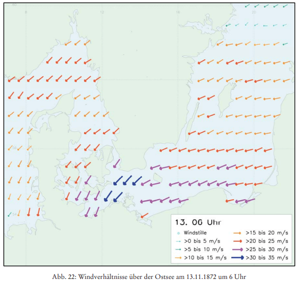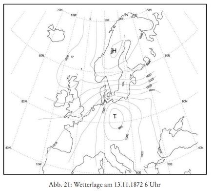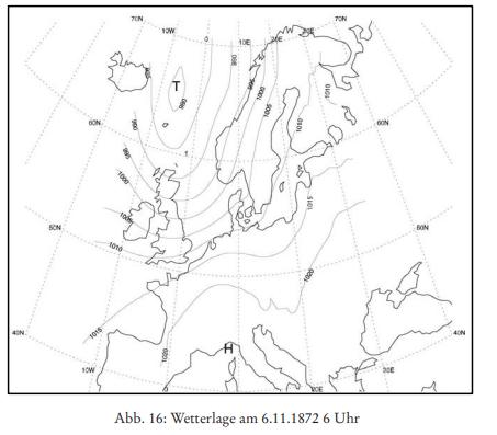 Grafiken entnommen aus: Rosenhagen, G., & Bork, I. (2009). Rekonstruktion der Sturmwetterlage vom 13. November 1872. Die Küste, 75 MUSTOK, (75), 51-70.