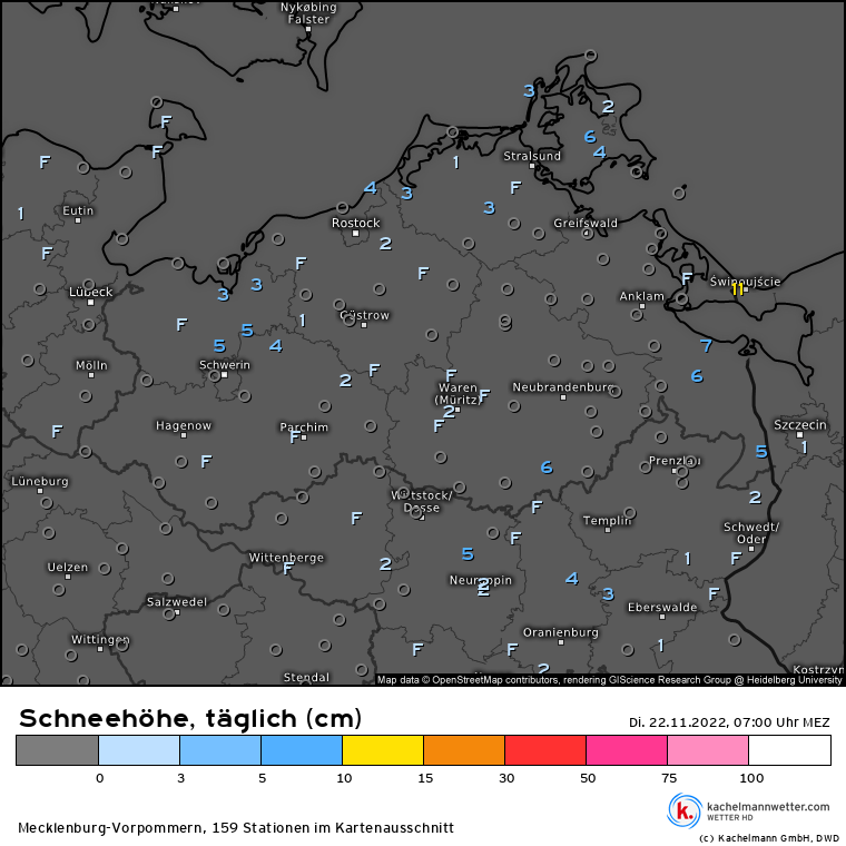 Schneehöhen-Meldungen am 22. und 23. November 2022 in MV
