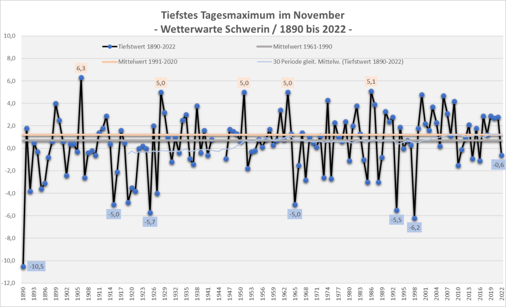 In Schwerin lag die Tageshöchsttemperatur bei -0,6°C. Es ist der erste Eistag im November in der Landeshauptstadt seit 2016. Das Diagramm zeigt das jeweils tiefste Tagesmaximum im November in Schwerin seit 1890. Sehr eisige Tage mit Höchstwerte um -5°C oder niedriger gab es zuletzt 1998 und 1993. Der Datenpunkt der diesjährigen -0,6°C liegt auch unterhalb des langjährigen Mittels.