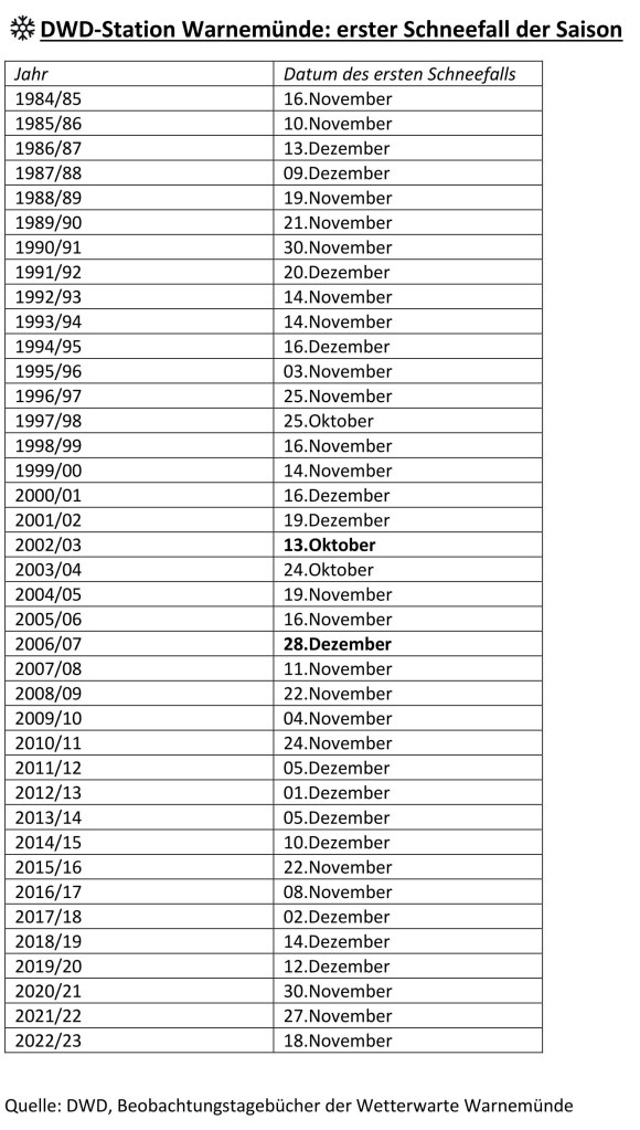 Eine Statistik des Datums des ersten Schneefalls in Warnemünde seit 1949. Die Rekorde liegen beim 13. Oktober (2002) als frühesten Termin und dem 28. Dezember 2006 als spätesten.