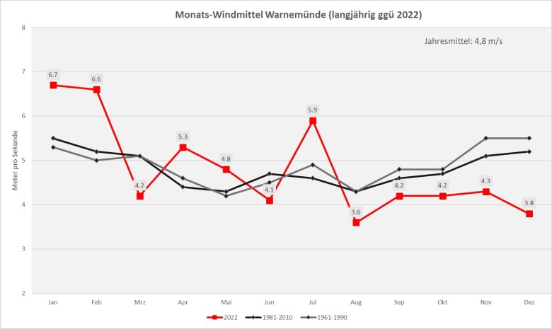 Der Monat mit der höchsten Durchschnittstemperatur war der August mit 20,1°C (+3,4 K ggü 1961-1990). Die größte Abweichung vom Klimamittel schaffte jedoch der Februar mit +4,5 K im Vergleich zum 30-Jahreswert der Referenzperiode 1961-1990. Der Oktober war mit 13,3°C der wärmste seiner Art in der Warnemünder Messreihe. Der kälteste Monat in 2022 kam zum Schluss. Es war der Dezember mit 2,1°C im Mittel. Er „rettete“ mit 6 Eistagen und 14 Frosttagen die bis dahin miserable Winterbilanz des Jahres, denn Januar und Februar brachten nahezu gar nichts in Sachen Kälte und Schnee zustande.